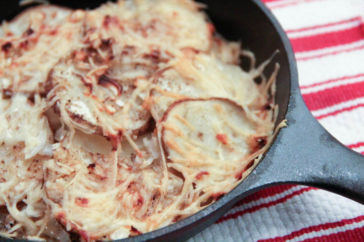 The other night I asked Clay (my husband) what he wanted with his crab cakes, I was thinking something along the lines of green beans, but he answered “potatoes au gratin.”  As I contemplated how on earth I could make this cheesy, creamy, starchy side dish remotely healthy, I remembered my sister mentioning that her mother in law had a simple and healthier recipe for this dish.  When I called my sister for the recipe I was thrilled to discover that this version of potatoes au gratin only contained five ingredients; potatoes, Parmesan cheese, butter, salt and pepper.  Clay could not fathom that I would attempt to make this dish without any sort of cream, but I think he was pleasantly surprised with the finished product!