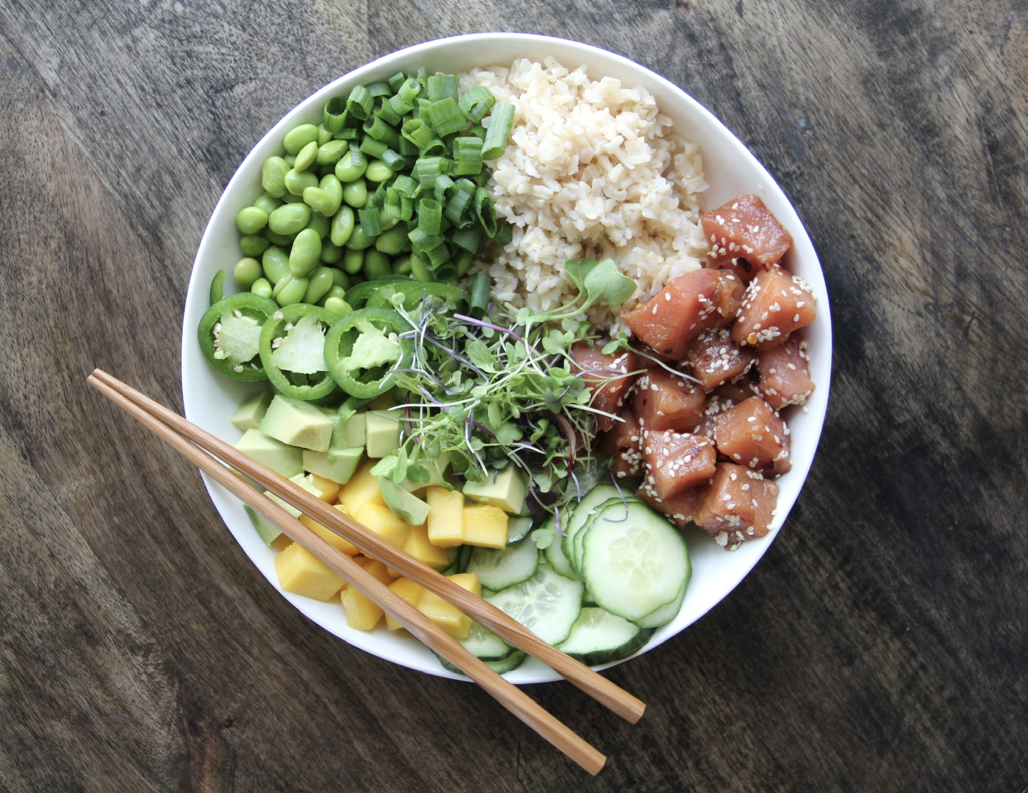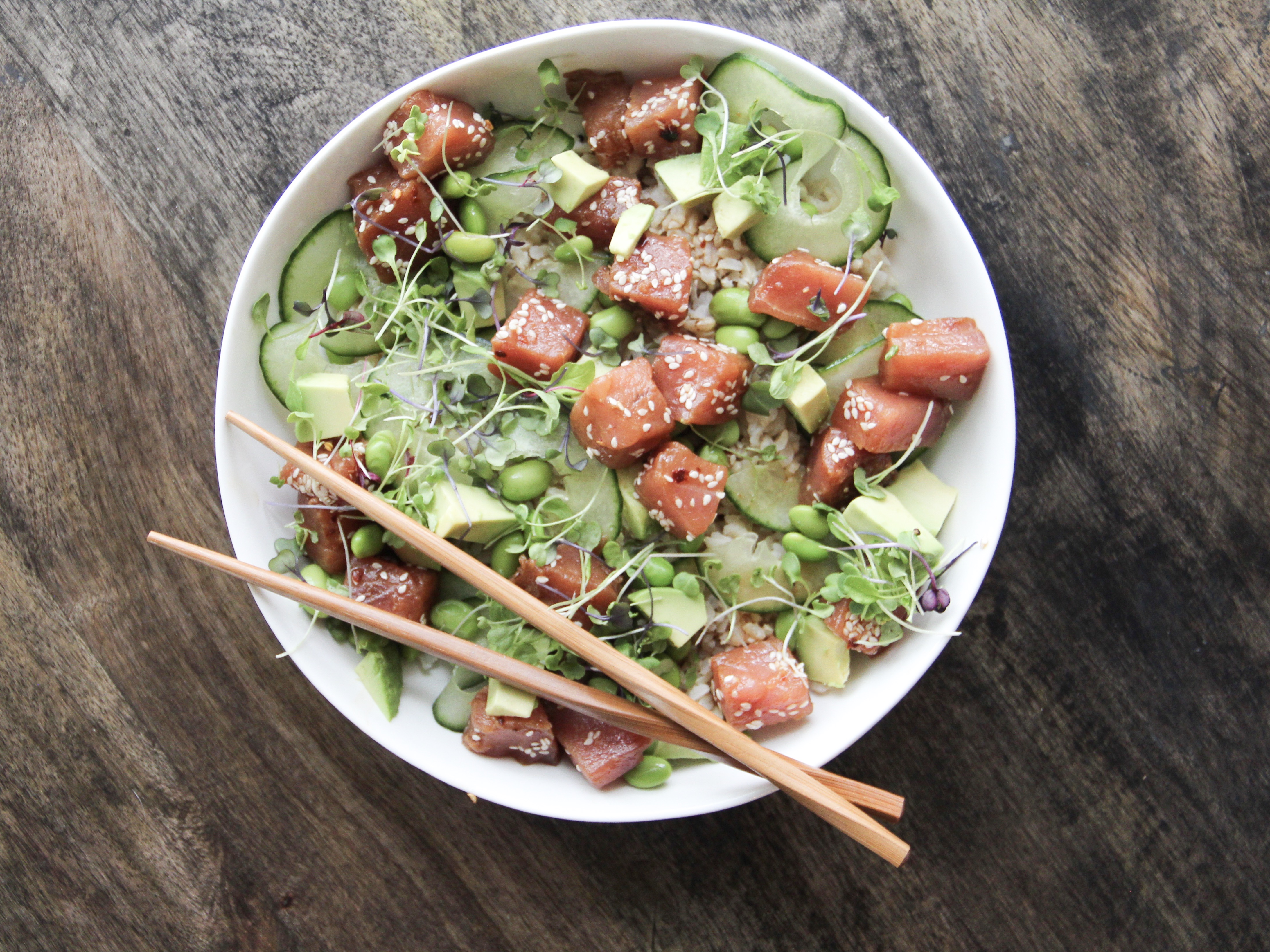 Prepare all the other ingredients for your bowls while the tuna is marinating. I always like to include brown rice, avocado and cucumbers, but then get creative with anything else I may have on hand (mango, edamame, thinly sliced jalapeño, microgreens, chopped green onion, etc.).