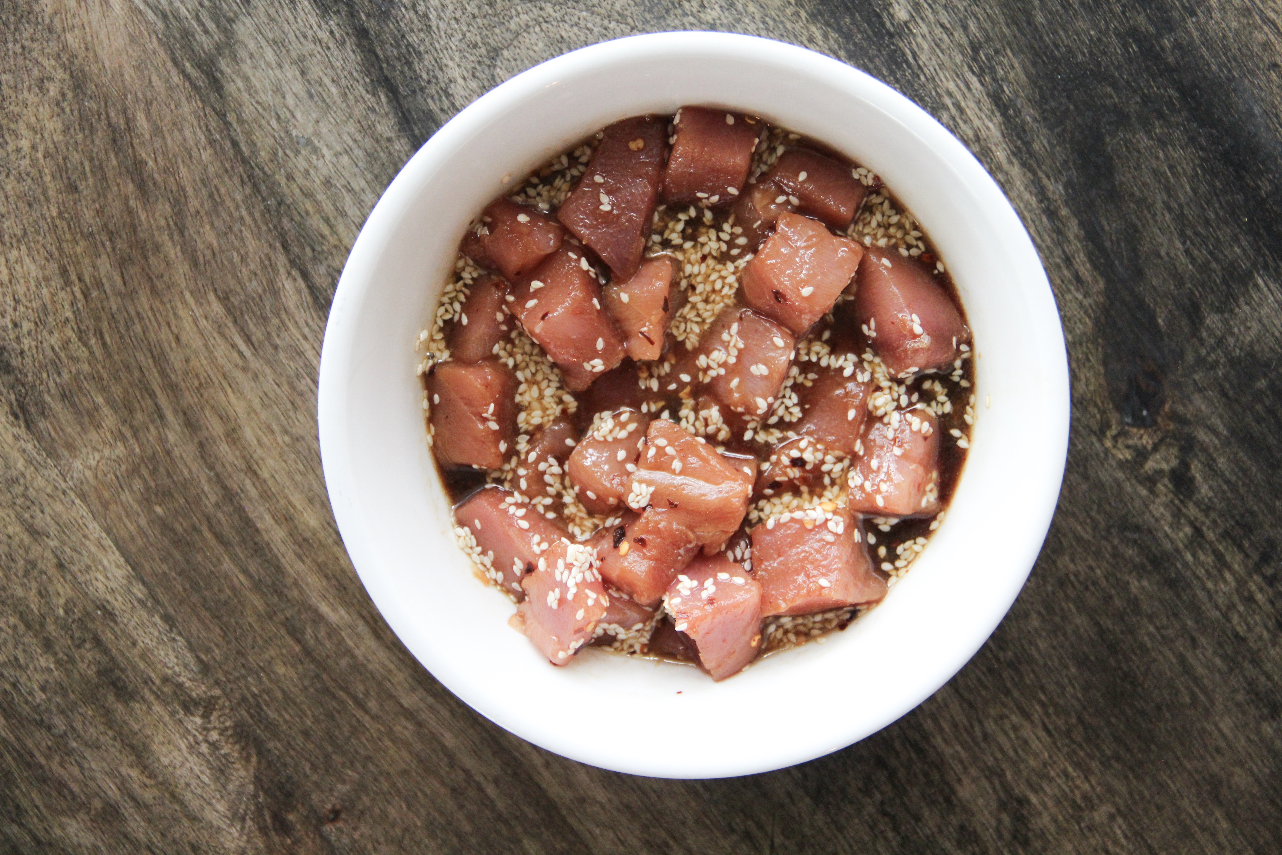 Mix together soy sauce, sesame oil, rice vinegar, minced ginger, white sesame seeds and red pepper flakes. Cut tuna into bite-sized pieces. Toss tuna well in the soy sauce marinade and let sit in the refrigerator for about 30 minutes.